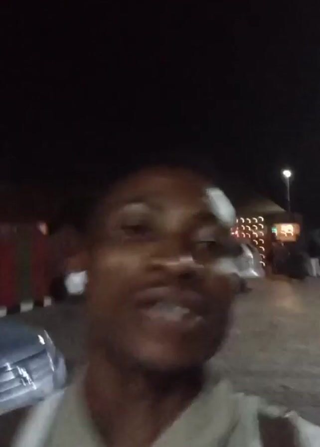The video is a selfie taken at night by a person with dark skin, short hair, and white earbuds