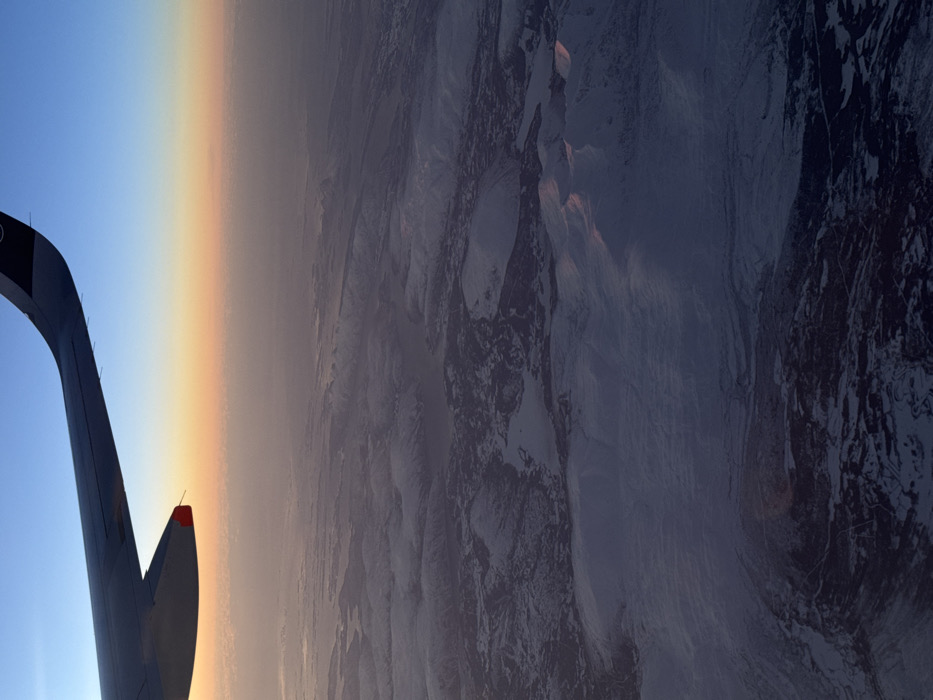An airplane wing, with a visible black emblem, slices into a blue sky transitioning to a hazy, golden-toned horizon. Beyond, a rugged landscape of snow-dusted mountains and deep valleys stretches out. The scene is captured from a high vantage point, possibly mid-flight, offering a vast view of the Earth's surface. The texture of the terrain contrasts with the smooth, manufactured surface of the aircraft wing.