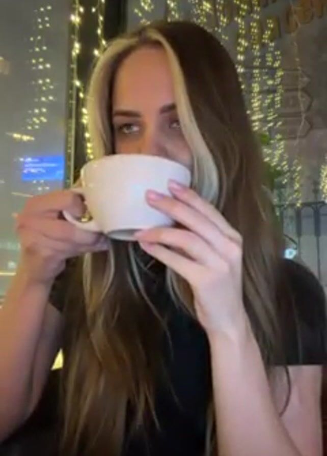 - "A woman with blonde-streaked brown hair sips from a white cup in front of a window decorated with string lights" by FM-9DXf93, licensed under CC BY 4.0