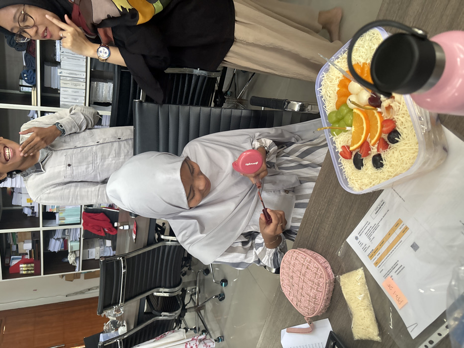 A woman wearing a gray hijab is seated at a desk, preparing a fruit salad. She uses a tool to peel or cut fruit. A container filled with grated cheese and assorted fruits like grapes, oranges, and strawberries is visible. There is a pink purse on the desk along with other office supplies. Two other people are standing nearby, and one is laughing. The background shows office shelves filled with files and documents.
