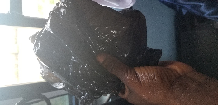 A dark-skinned human hand is shown grasping a crinkled black plastic bag