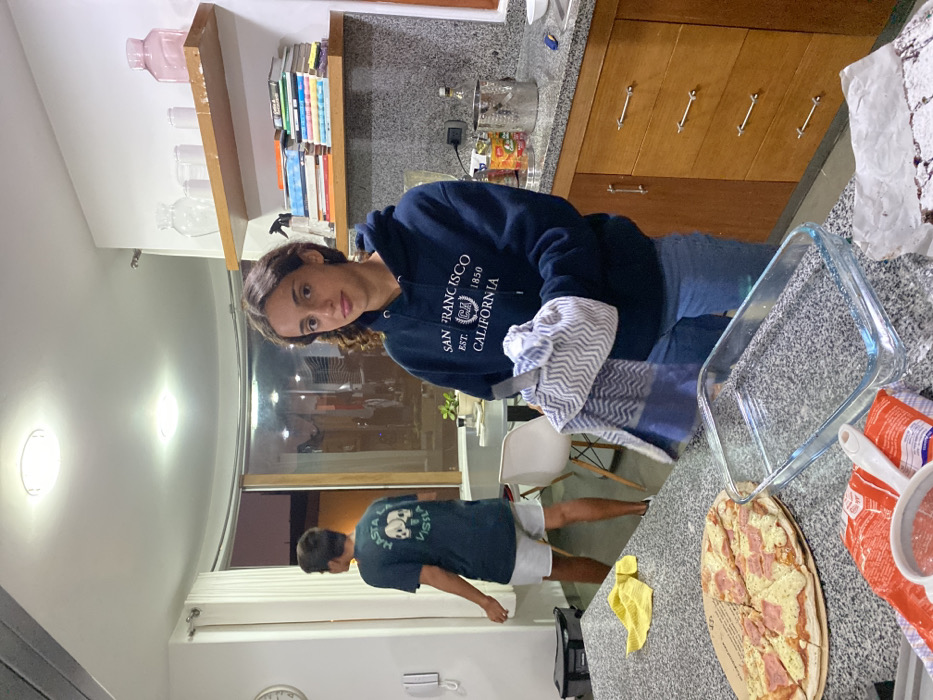 A young woman, wearing a dark blue hooded sweatshirt with the text "San Francisco" printed on it, is standing in a kitchen in Chorrillos, Peru (latitude: -12.213, longitude: -77.001). She holds a knife and a striped blue towel in her left hand, wiping it. A man in a green shirt, holding a book, is walking in the background. There is a pizza on the counter, as well as an empty glass baking dish and a sieve with white powder. The kitchen has white walls, dark brown cabinets, and a window with a view of a street outside. There are shelves above the cabinets with a few objects and many books. The lighting is bright and the room is tidy.