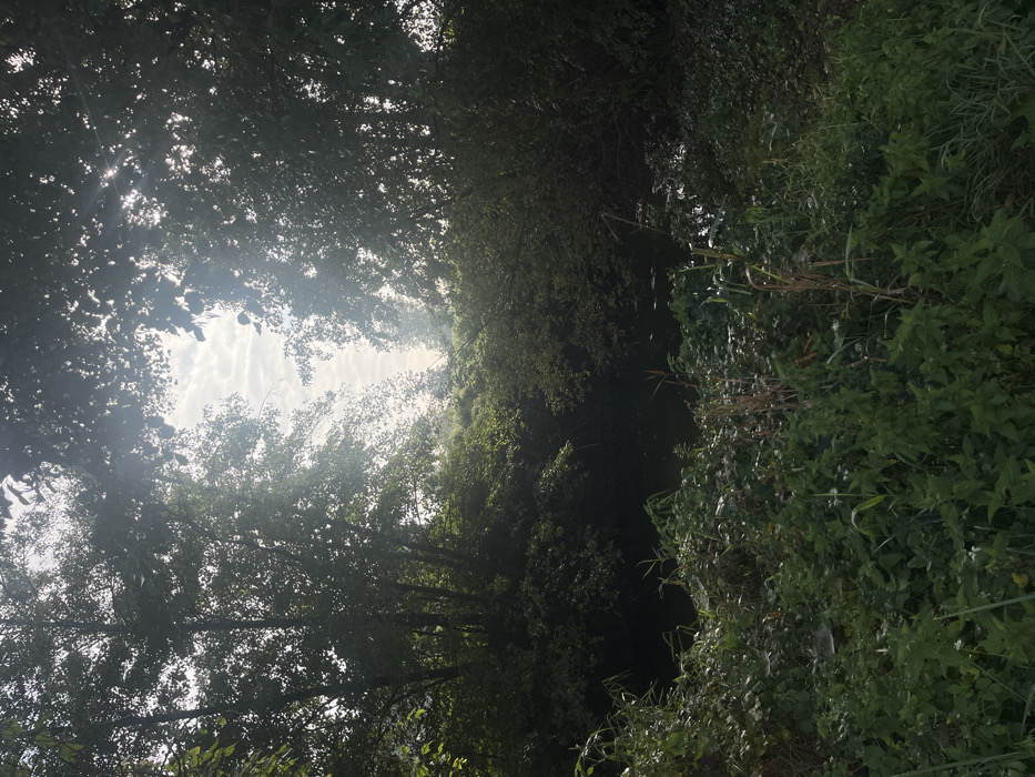 The image displays a dense natural environment, presumed to be within Weyersheim, France. A narrow, dark body of water, likely a stream or canal, occupies the mid-ground, its surface largely obscured by surrounding vegetation. Overhead, a dense canopy of mature trees with dark green foliage frames a bright, hazy sky featuring scattered white clouds and visible atmospheric diffusion, indicating strong backlighting. The foreground and immediate banks are covered in thick undergrowth, comprising various green plants, grasses, and some dried herbaceous stalks. No individuals, animals, or artificial structures are discernible within the frame. The scene is illuminated by ambient daylight, with light filtering through the canopy, casting much of the lower vegetation into shadow while silhouetting the upper tree line against the bright sky.