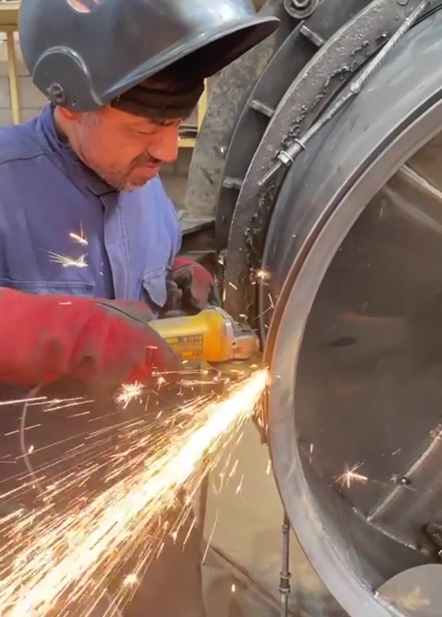 man grinding metal with a power tool. The man is wearing protective gear, including a welding helmet and red gloves, and a dark blue long-sleeved shirt over dark pants. He is operating a small, yellow electric grinder on a large, dark metal, circular object. Bright orange sparks fly from the point of contact between the grinder and the metal. The setting appears to be an industrial workspace, evidenced by the brick wall visible in the upper left corner and metal stands supporting the object being worked on.
