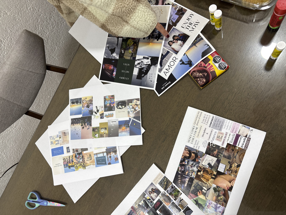 A collection of printed images and phrases arranged on white paper sit atop a brown table. Two collage sheets have a mix of photos, including travel scenes, fashion items, and personal aspirations. Phrases like "Prioritize Your Peace," "Confident," and "Enjoy the Now" are visible. Several glue sticks and a pair of scissors also appear on the table, suggesting a crafting or creative project. A beige chair sits to the left of the table.
