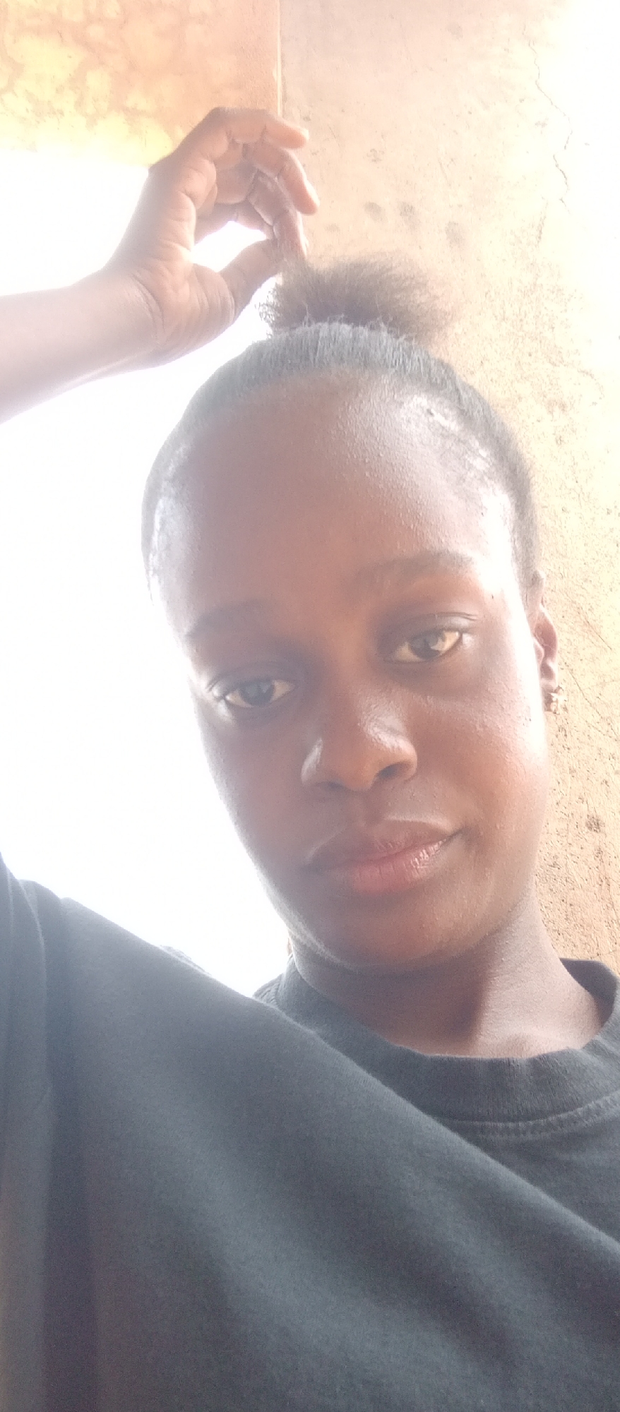 A close-up, angled shot of a person with dark skin and dark hair pulled into a bun. One hand is raised to their hair. The person wears a dark-colored shirt. The background is a textured wall with beige and brown tones. The exact location within Akwanga, Nigeria, cannot be determined from the image.