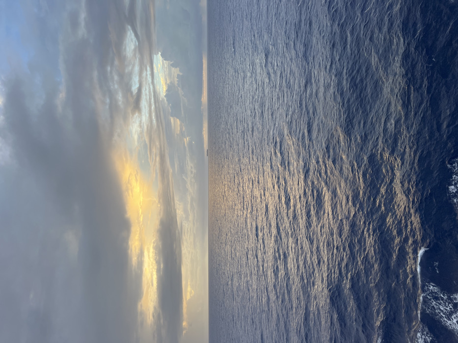 The scene depicts an expansive view of the open ocean, observed from an elevated position, likely from a vessel. The location is open ocean. The sky occupies the upper half of the frame, characterized by a dense, layered cloud cover ranging in color from dark grey to lighter grey and subtle blues. A prominent horizontal band of intense golden-yellow light penetrates the clouds in the left-center portion of the sky, extending towards the right. The horizon line is clearly defined, separating the sky from the water. The ocean surface, filling the lower half of the image, exhibits deep blue tones with visible ripples and small wave patterns across its entirety. A reflection of the golden sky light is cast upon the water, creating a shimmering path that stretches from the horizon towards the foreground, primarily in the left-center. On the distant horizon, slightly to the right of the frame's center, a solitary, dark-hulled vessel, appearing small due to distance, is visible. At the extreme bottom-left edge of the image, a patch of white foam indicates water disturbance, consistent with movement of the observation platform. No individuals are present. The overall lighting conditions suggest either a sunrise or sunset.