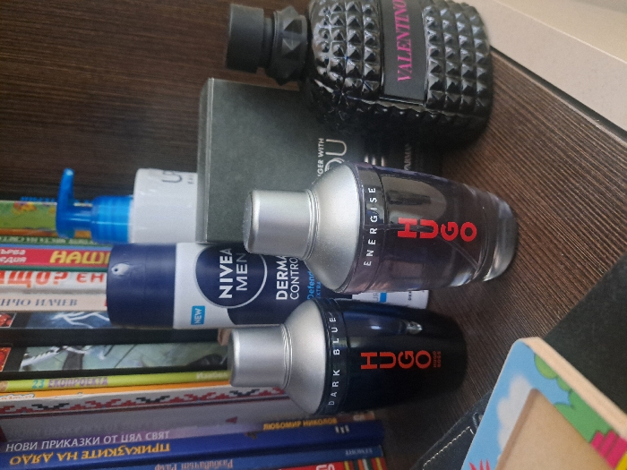 The scene is located in Montana, Bulgaria. The image displays a still life composition of various personal care and fragrance products arranged on a brown wooden shelf with horizontal grain. In the foreground, a portion of a light-colored wooden object with colorful illustrated borders is visible on the left. From left to right on the shelf, the following items are present: 1. A dark blue, cylindrical bottle with a silver cap, bearing the label "HUGO DARK BLUE" and vertical red "HUGO" lettering. 2. A white and dark blue aerosol can, labeled "NIVEA MEN DERMA CONTROL." 3. A clear, cylindrical bottle with a silver cap, labeled "HUGO ENERGISE" and vertical red "HUGO" lettering. 4. Behind the "HUGO ENERGISE" bottle, a partially visible dark gray rectangular box, with discernible text "WITH YOU." 5. Partially obscured behind the Nivea can and the dark box, a white bottle topped with a blue pump dispenser is visible. 6. A dark-colored bottle with a textured, possibly studded or faceted, surface and a black cap, featuring "VALENTINO" in pink lettering. The background consists of a bookshelf filled with numerous books. Their spines display various colors, including blue, white, red, and green, with text primarily in Cyrillic script. The lighting is ambient, casting subtle shadows on the shelf surface. No individuals are present in the image.