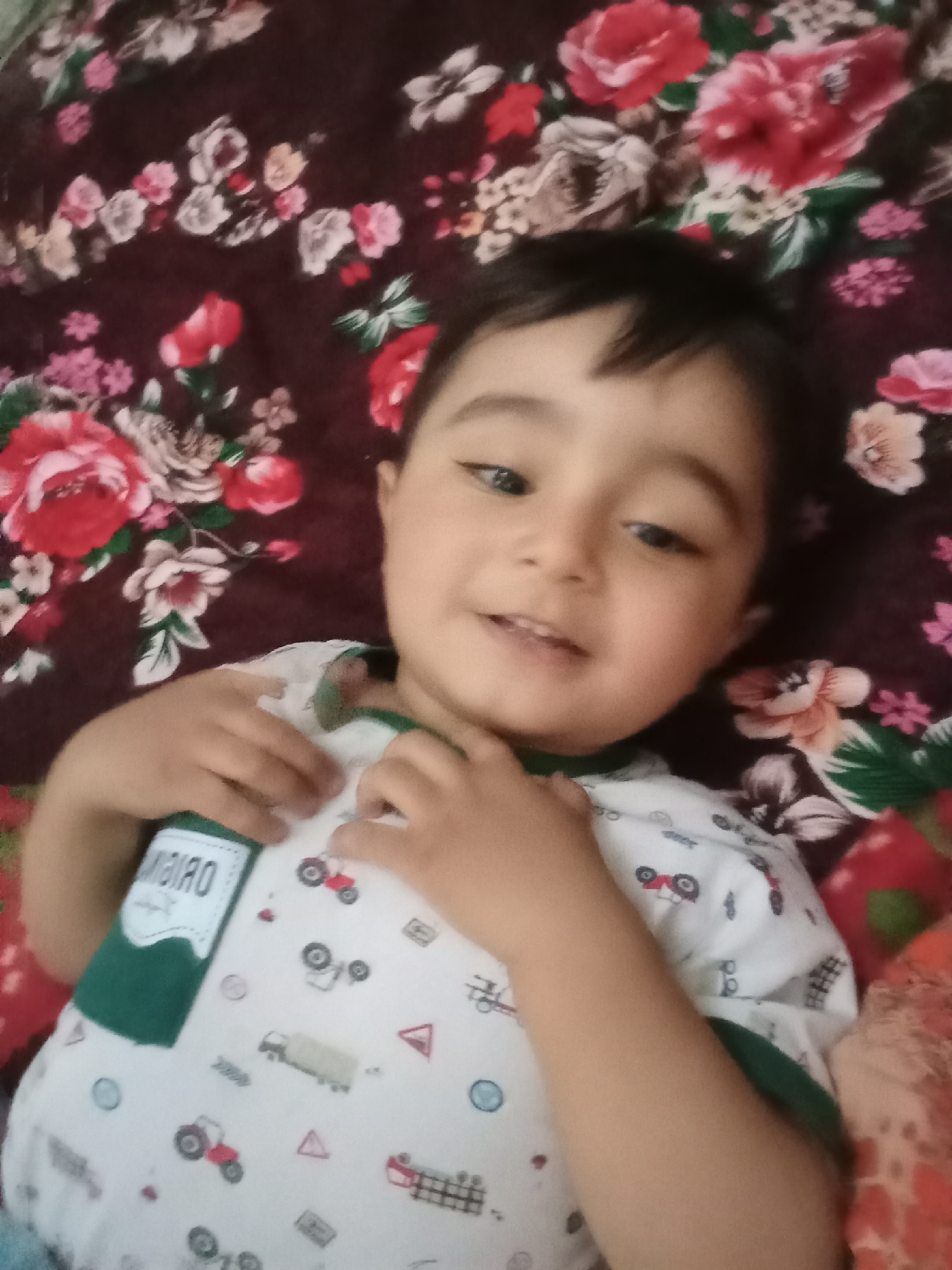 The scene depicts a young child in an indeterminate indoor setting within the city of Unknown, Unknown. The child, appearing to be a toddler with dark hair and light complexion, is positioned centrally in the frame, lying supine, exhibiting a slight smile with a partially open mouth, and gazing slightly upward and to the right. The child wears a white short-sleeved top featuring green trim around the collar and sleeves. The top is patterned with various vehicle illustrations, including tractors and trucks, alongside road sign motifs. A green patch with white text is visible on the left side of the shirt. Both of the child's hands are clasped together near the center of the chest. The child is resting on a dark red or maroon fabric surface, which is patterned with large red, pink, and white floral designs, including roses and associated foliage. A small portion of an additional red and orange patterned fabric is visible along the right edge of the frame.