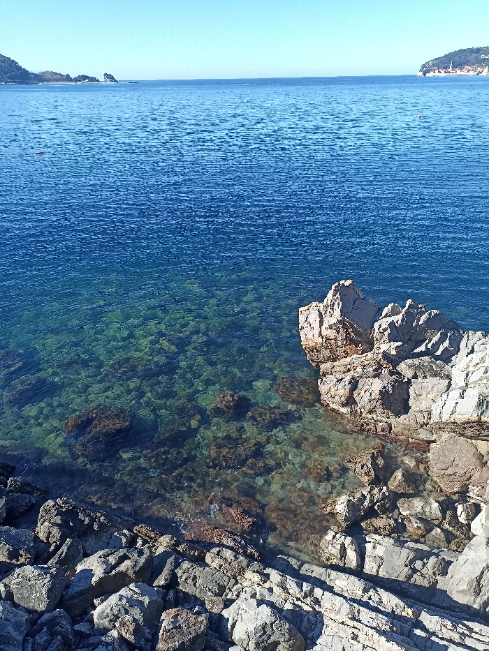 The image displays a sunlit coastal scene in Budva, Montenegro. The foreground is composed of a rugged arrangement of grey and light brown rocks, some submerged in the water. The water immediately adjacent to the shore is transparent, revealing a rocky seabed with visible green and dark brown marine growth. Beyond the shallows, the water deepens to a vibrant blue, exhibiting subtle surface ripples. A distinct, light-colored rock formation juts into the water from the mid-right. In the middle distance, a small red buoy floats on the water towards the right, and an indistinct dark object is faintly visible on the water to the far left. The horizon line is flat, meeting a clear, light blue sky. In the far background, a green, tree-covered island or headland is visible to the left. To the right, another verdant headland extends into the sea, with a cluster of white buildings, characteristic of a coastal town, visible at its base, identifying the historic center of Budva. No people or immediate actions are depicted within the scene.