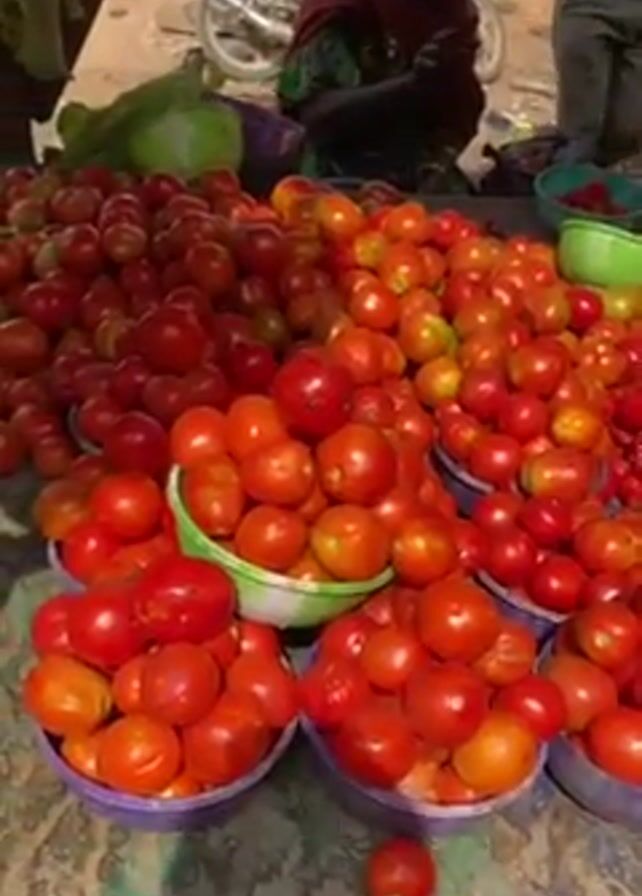 The camera pans across a market stall overflowing with red produce. Piles of bright red tomatoes fill multiple purple bowls, while a large mound of fiery orange and red scotch bonnet peppers sits to the side. An older woman in a dark headscarf sits behind the stall, facing forward, while a man in a striped shirt stands nearby. Other people are visible milling around the stall, and a man in a black shirt appears to be sorting through peppers. The market area appears to be outdoors on a bright, sunny day.