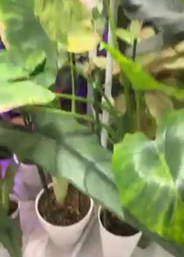 collection of houseplants under artificial lights. The plants are in white pots and are arranged on a white floor. The plants have large, green leaves with distinct veining. The lights are mounted on a white frame that extends above the plants. The plants appear healthy and well-cared for.