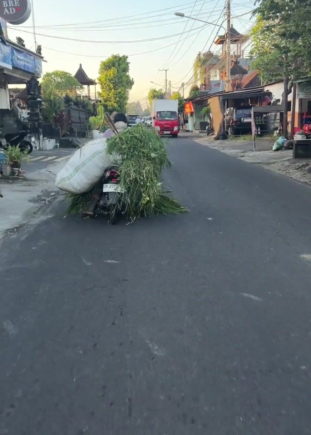 man riding a motorcycle on a narrow road in Bali, Indonesia. The motorcycle is heavily loaded with a large white sack and a lot of green foliage, obscuring much of the vehicle. The man is mostly obscured by the load. Traffic passes by including a red Isuzu truck, other motorcycles, and a white Suzuki XL7. The road is paved and the surrounding area features various businesses, shops, and traditional Balinese architecture. The sky is clear and it appears to be early morning or late afternoon based on the lighting.