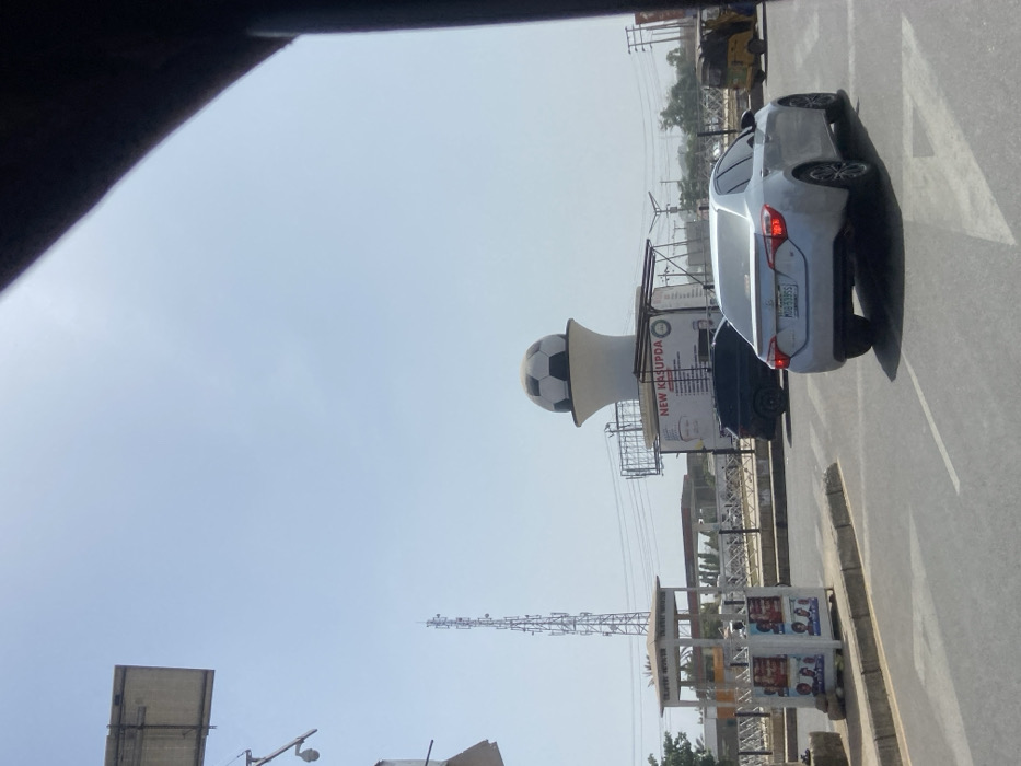 This image captures a bright daytime street scene, likely a junction or roundabout, viewed from inside a vehicle. The sky is clear and light blue. In the immediate mid-ground, a silver Toyota Corolla sedan with license plate MDB 539SS is observed moving away from the viewer on an asphalt road featuring white directional arrows. A dark-colored SUV is partially visible behind the sedan. To the far right, a yellow motorized tricycle (Keke Napep) also travels away. The central focus is a monument consisting of a white, trumpet-shaped pedestal topped with a large, spherical black and white soccer ball. Behind this monument, a billboard sign prominently displays the text "NEW KASUPDA" in white letters, indicating the Kaduna State Urban Planning and Development Authority, situated within Kaduna State, Nigeria. To the left of the road, a light-colored kiosk or booth displays posters featuring portraits of individuals. A tall, lattice-structured telecommunication tower stands further to the left, extending high into the sky. Scattered green vegetation is visible in the background, alongside the faint outlines of other structures. In the upper left quadrant, a large, dark rectangular panel, possibly a solar panel or part of a signage structure, is partially visible, along with a white security camera. No individuals are distinctly visible beyond the portraits on the kiosk.