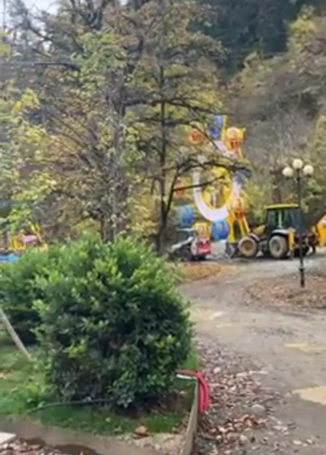 park in autumn. There are construction vehicles near a small Ferris wheel. The camera pans to a pathway alongside a river. People are walking along the path. The forest around the river shows fall foliage.