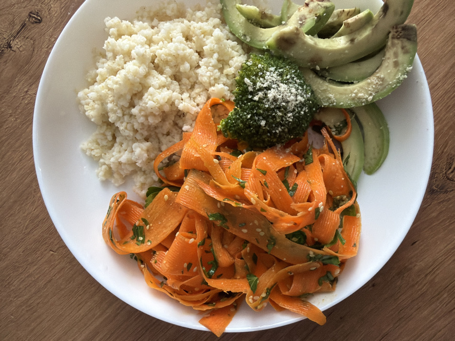 A white, round plate containing a prepared meal is positioned on a wooden surface, likely a table, in Прикамский, Russia. The plate holds distinct food components. On the left side, a large serving of bright orange carrot ribbons is present, mixed with chopped green herbs and white sesame seeds. To the upper right, a portion of light-colored, granular millet is arranged. Below the millet and adjacent to the carrot ribbons, several sliced green avocado wedges are visible, some exhibiting slight browning. A single green broccoli floret, topped with white grated seasoning, is situated between the carrot ribbons and avocado slices. No people, active events, or direct interactions are depicted within the frame.
