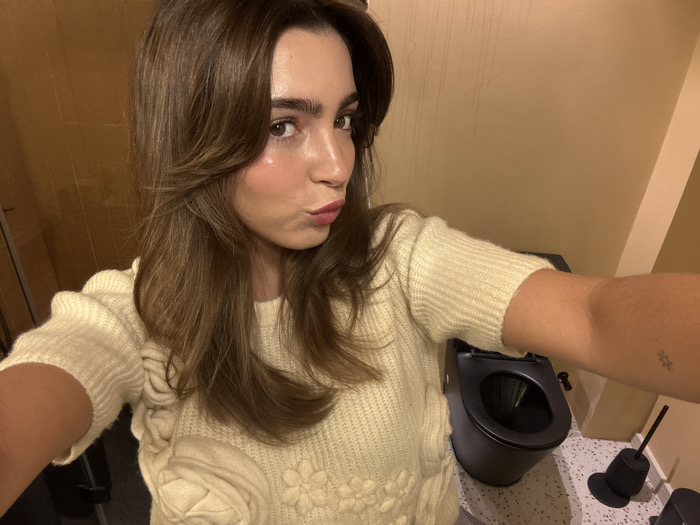A woman with long brown hair and bangs poses for a selfie. She wears a cream-colored sweater adorned with floral appliqués. Behind her, a modern, wall-mounted black toilet is visible against a speckled floor. A black toilet brush holder stands next to it. The walls appear to be beige, creating a simple, clean backdrop for the image. The lighting is warm, highlighting the woman's features.