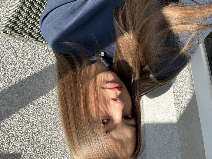 The scene depicts a young female located in Stara Zagora, Bulgaria, positioned outdoors on what appears to be a balcony or patio. The subject has long, straight, light brown hair and dark eyes, and is looking directly into the camera with a neutral expression. She is wearing a plain dark blue hooded sweatshirt, with a small, light-colored, possibly metallic, charm visible at the neckline. The lighting is characterized by strong, direct sunlight, illuminating the left side of her face and hair (viewer's perspective) and casting prominent shadows across her right cheek, eye, and a significant portion of the background. The background features a textured, light gray stucco wall, exhibiting distinct angular shadows. To the right of the subject, a segment of a gray, woven synthetic rattan-style outdoor chair is visible.