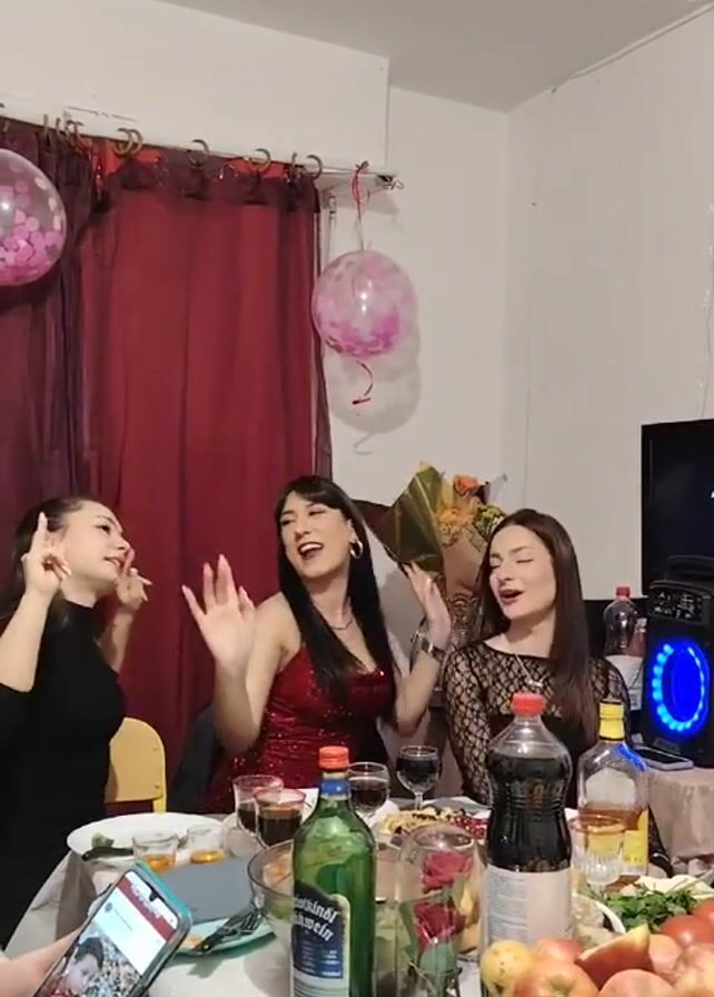 three women celebrating around a table filled with food and drinks. The woman on the left wears a black dress and has her hair pulled back, while the woman in the middle is wearing a red sequined dress and the woman on the right is wearing a black lace dress. They are all smiling, laughing, and dancing to music. There is a bouquet of flowers in the center of the table, and balloons and string lights decorate the room. Bottles of alcohol and Coca Cola are placed on the table, along with glasses of wine, and plates of food. A person is recording the video on a cell phone. There is a burgundy curtain to the left. A speaker with blue lights is visible on the right, as well as a television.