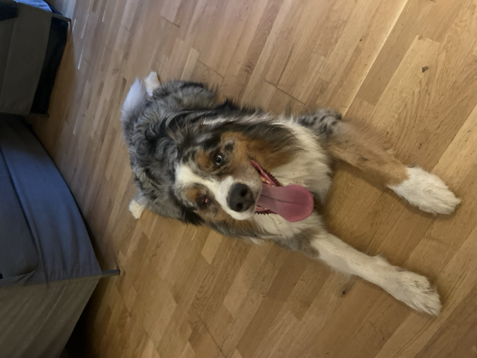 - "A merle-patterned dog, consistent with an Australian Shepherd breed, is lying prone on a light-colored wooden floor" by FM-OpQwB2, licensed under CC BY 4.0