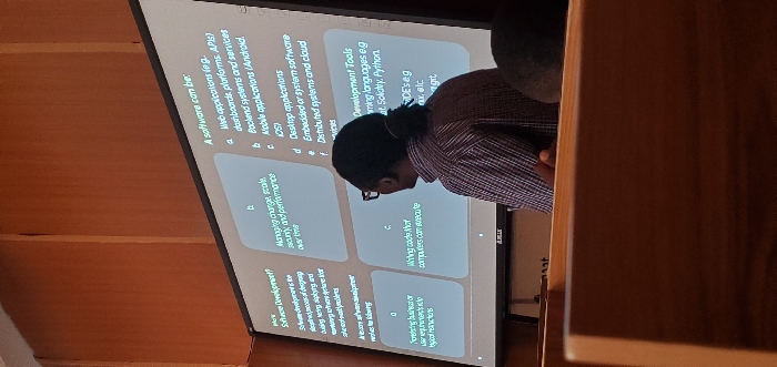 - "An indoor scene, likely a lecture hall or classroom in Jos, Nigeria, features the back of an individual with dark hair tied in a bun, wearing glasses and a striped shirt, attentively viewing a large projector screen" by FM-wiHtw1, licensed under CC BY 4.0