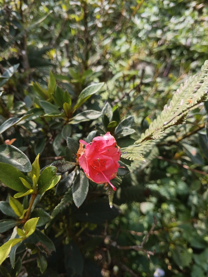 A single, partially opened flower, predominantly fuchsia-pink, is centrally positioned. Its petals show minor irregularities, and multiple visible stamens and a pistil extend from its center. The flower is attached to a stem surrounded by dark green, ovate leaves. The immediate foliage displays various shades of green, with some leaves exhibiting lighter highlights from natural illumination. The background consists of heavily blurred green foliage and branches, indicating a shallow depth of field. No individuals, actions, or specific interactions are depicted. The scene is located in the city of Tamghas, Nepal.