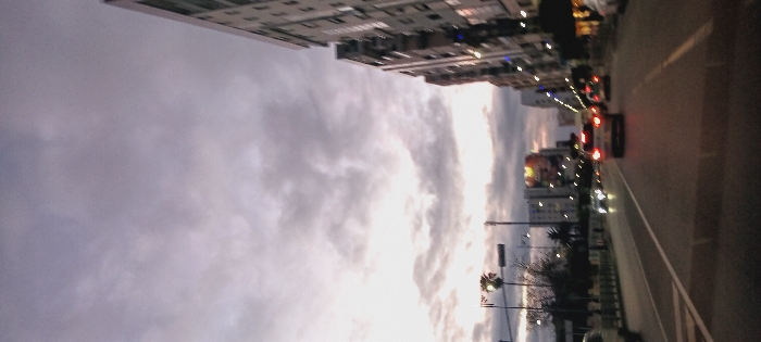 A cityscape at dusk features a street with moving cars, their headlights illuminating the dark road. Buildings line the street, illuminated by streetlights and building lights. The sky above is filled with dramatic clouds, hinting at a setting sun or impending night. Tall trees and palm trees are visible, adding to the urban landscape.