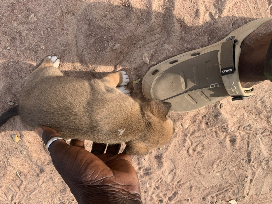 A small brown puppy with white paws lies on sand, partially supported by a dark-skinned hand wearing a silver ring. The puppy's head is near a foot clad in a tan Crocs sandal. The sand is a light reddish-brown hue. The puppy's tail is dark. The person in the sandal is wearing camouflage socks. The scene is brightly lit.