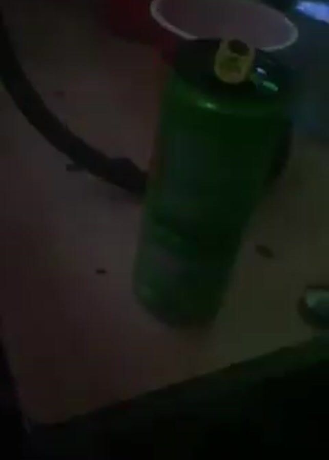 The video depicts a table with a green energy drink can, a red plastic cup, and a black hose, likely for a hookah. There's also a bottle of water in the background. The lighting is dim, with a reddish-purple hue cast over the scene. The table appears to be made of wood. There is also some faint music playing in the background.