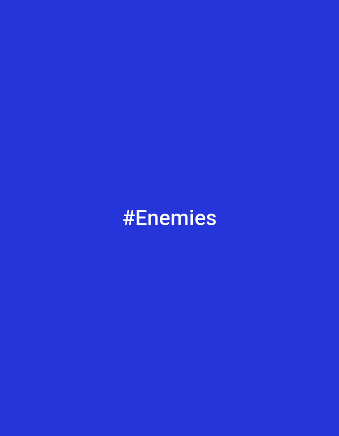 The image displays a uniform, solid blue background. Centered horizontally and vertically on this blue field is the white text "#Enemies". No other visual elements, figures, objects, or environmental details are present. The image does not depict any identifiable location, including within the city of Guyancourt, France. No individuals, actions, or interactions are visible.