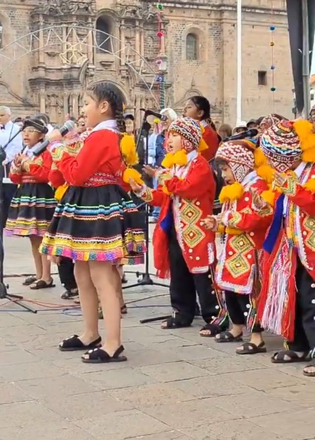 A group of children in traditional Andean clothing are performing on a stage outdoors