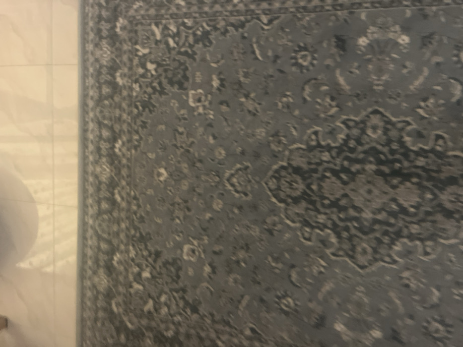 A patterned rug in shades of gray and white dominates the frame. Floral and geometric designs are visible within the rug's texture. To the left, light-colored floor tiles are partially visible, as well as a round object, possibly part of a chair. The image is slightly blurred.
