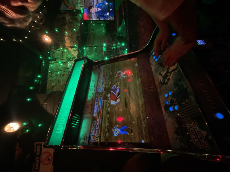 A dimly lit arcade setting presents a close-up of a "Play Game" arcade machine, showcasing an action game in progress. Multiple characters battle on screen. Blue illuminated buttons line the machine's control panel, attracting a player's hands poised to engage. Green Christmas lights adorn the background, creating a festive yet retro ambiance. A small television screen is visible above the game. A no-smoking sign is attached to the machine.