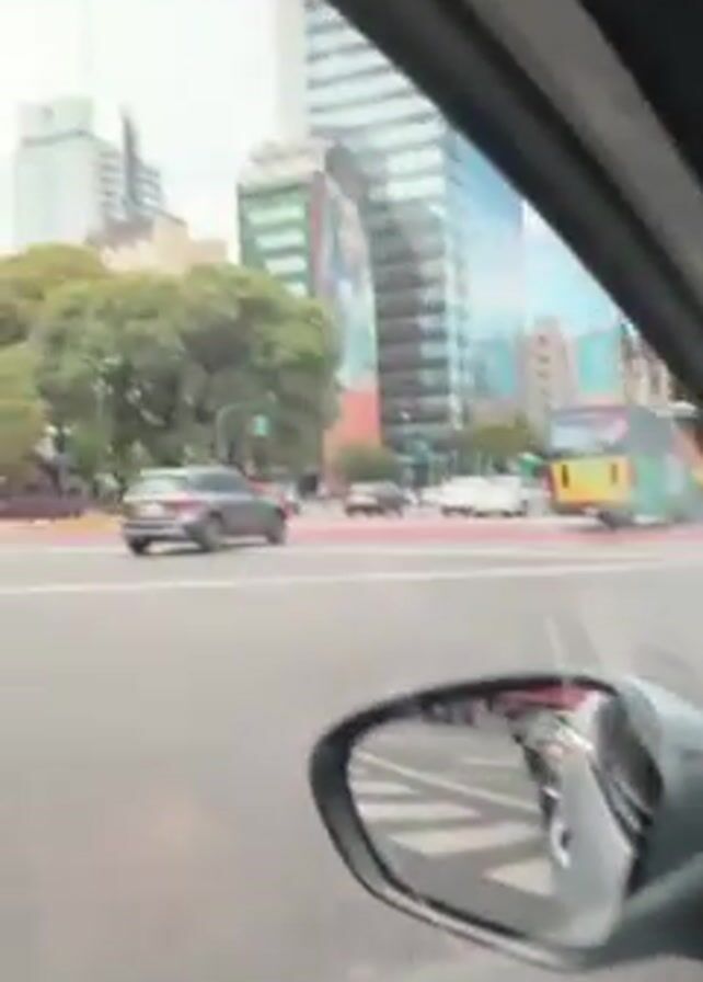 From inside a moving vehicle, the camera pans to showcase a very large mural of soccer player Lionel Messi on the side of a high-rise building. The mural is in color, showcasing Messi with his fist clenched in the air, in his Argentinian national team jersey. The building is a modern, glass-fronted structure. The street below shows cars, motorcycles, and buses moving through an intersection. The sky is overcast. The reflection of traffic and the street is also visible in the car's side mirror.