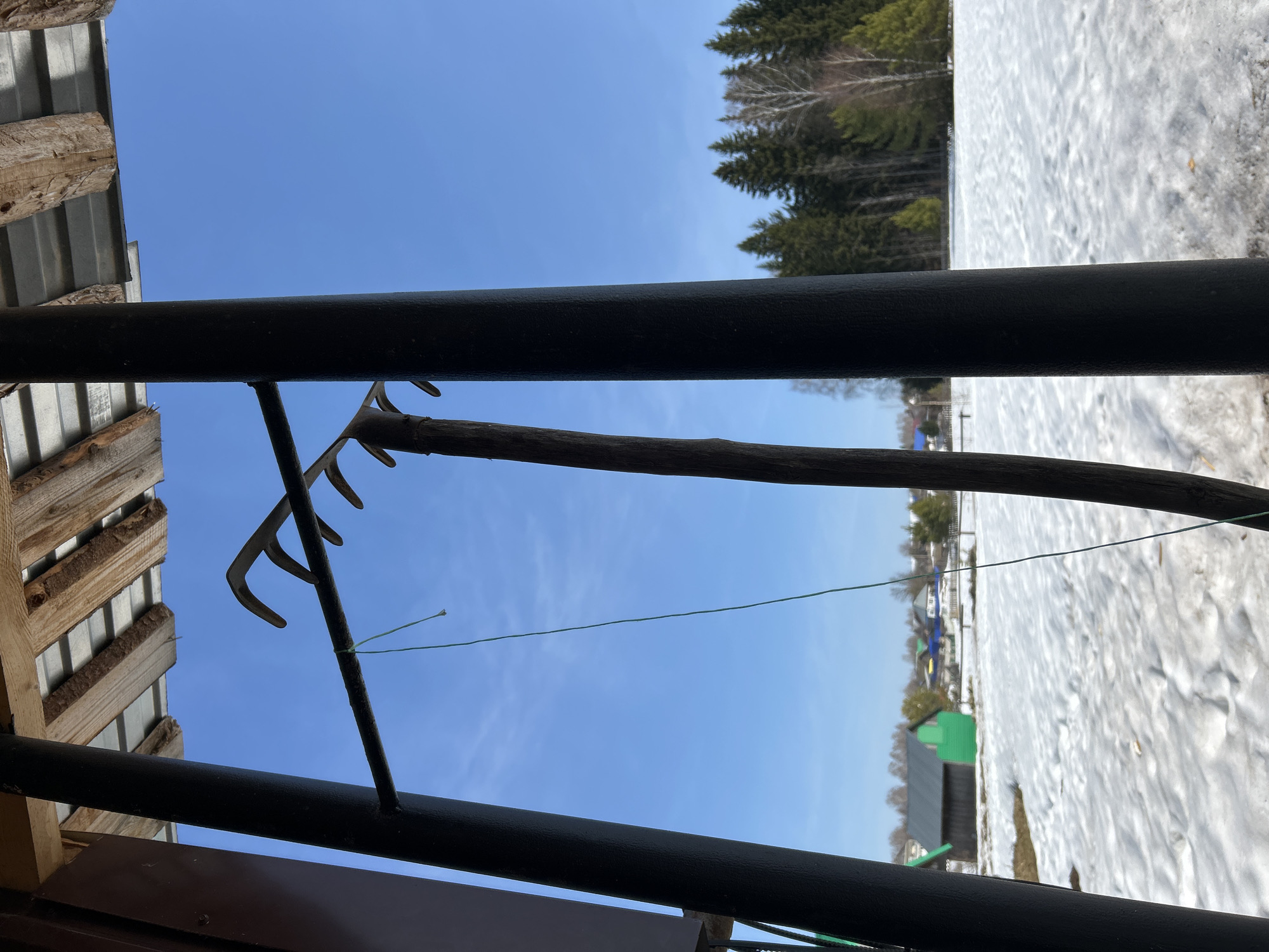 A low-angle, daytime shot taken in Уральское, Russia. In the foreground, there is a dark metal structure, partially obscuring the view. A rake with a wooden handle is suspended from the metal structure, angled slightly upwards. Through the gaps in the structure, a clear blue sky with wispy clouds is visible. Beyond the structure, a landscape is visible, including a snowy field or ground, a distant treeline of evergreen trees, and some scattered buildings. The buildings appear to be residential houses with various colored roofs. The scene suggests a rural or semi-rural environment.
