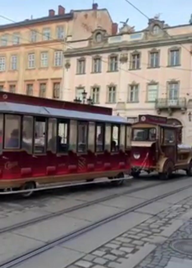 - "A red and gold, tram-like tour bus moves slowly along a cobblestone street in a city" by FM-BI1Cp2, licensed under CC BY 4.0