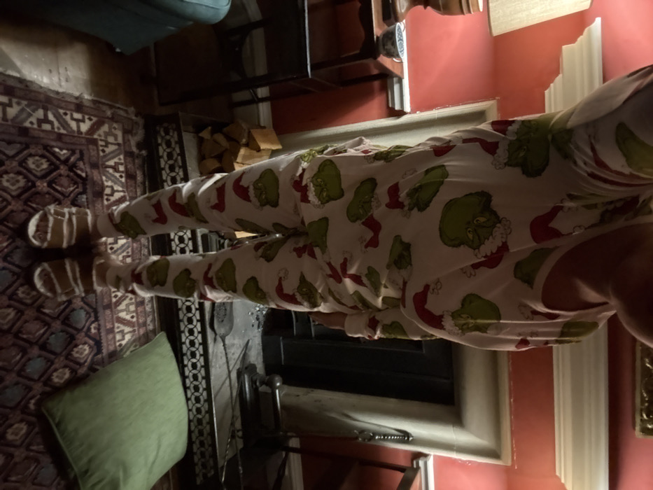 - "A person stands indoors wearing Grinch-themed pajamas and tan furry sandals" by FM-hCYEh1, licensed under CC BY 4.0