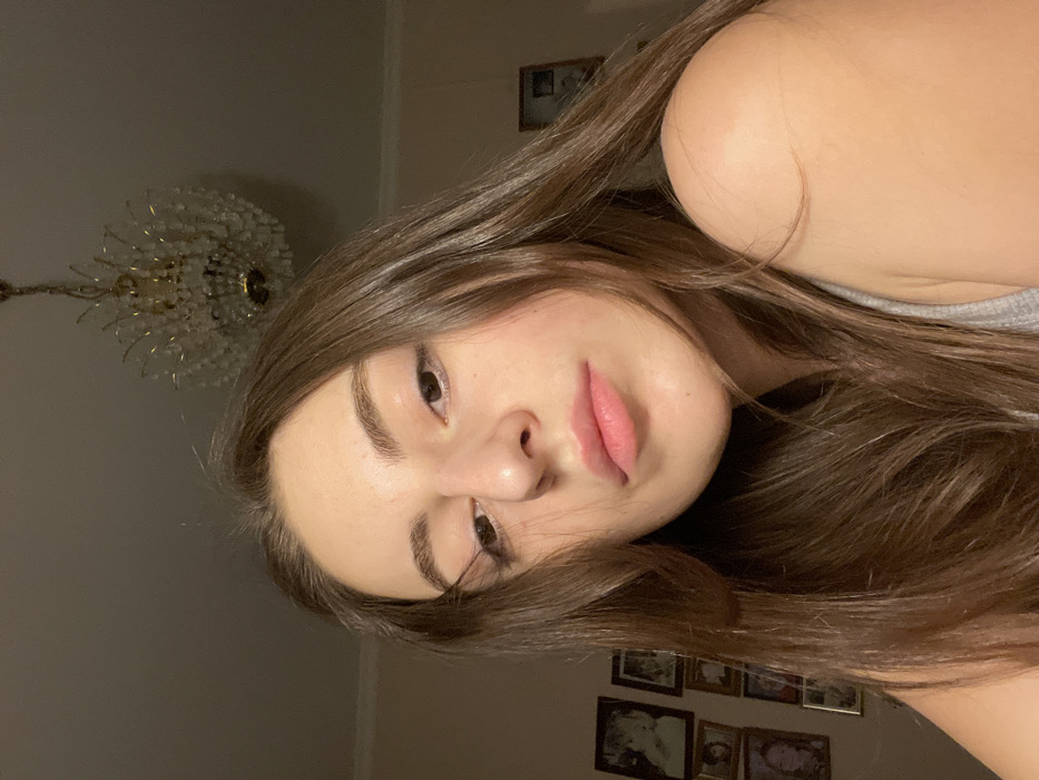 A woman with long, light brown hair, fair skin, and full pink lips reclines