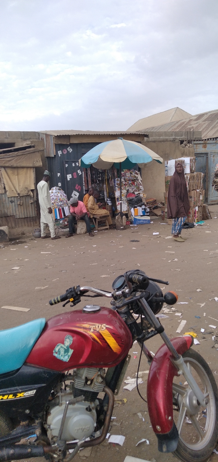 A street scene features a red motorcycle in the foreground. In the background, several people are seen, with one woman wearing a brown hijab. There is a small shop displaying various items under a striped umbrella, with the word "POS" visible on its facade. The surroundings appear to be a bustling market area with litter scattered on the ground and buildings with corrugated iron roofs in the background. The sky is overcast.