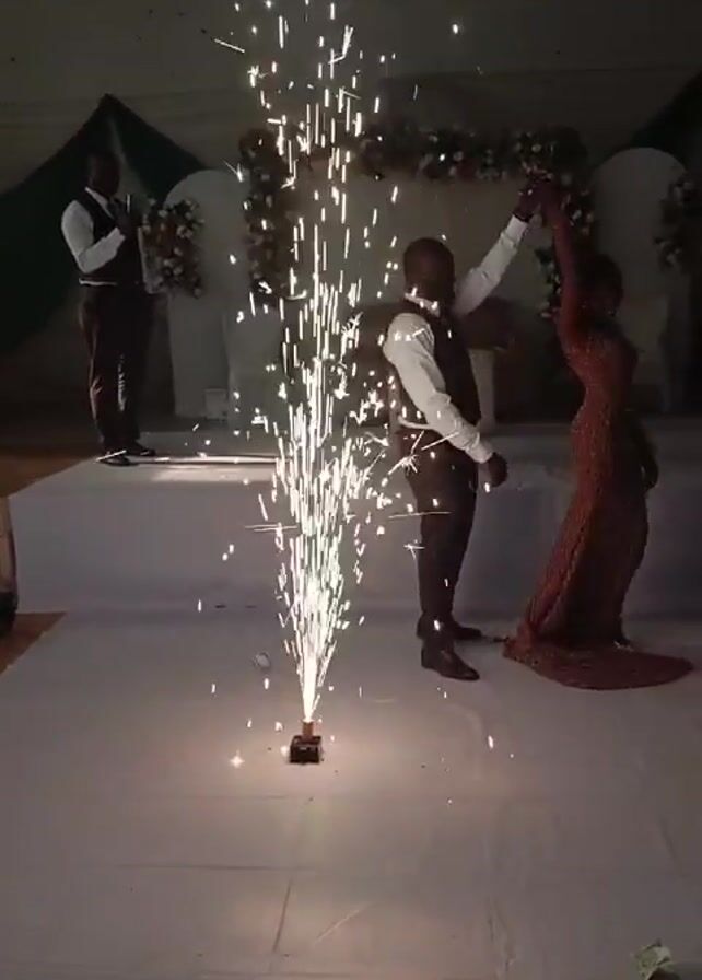 A couple is dancing at a wedding while a spark fountain erupts in the foreground. The couple, dressed in formal wear, is in the center of the frame, with the groom in a vest and the bride in a long, patterned dress. A wedding archway with flowers is visible in the background, along with a man standing to the side, possibly playing music. The scene is indoors, with a white floor covering and simple decorations. A person walks in front of the camera momentarily, obscuring the view briefly.