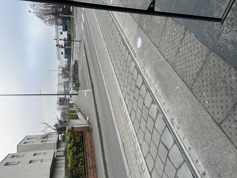 The image depicts an urban street scene in Bischheim, France, specifically at the intersection of Rue de la République and Rue des Frères Lumière, under an overcast sky. In the immediate foreground on the right, a dark vertical metal frame partially obstructs the view, adjacent to gray concrete paving featuring raised tactile bumps, indicative of a tram stop platform. Parallel to this, a single set of tram tracks is visible, embedded within a surface composed of rectangular gray cobblestones. These tracks run horizontally across the frame and recede into the distance. To the left of the tram tracks, an asphalt road stretches into the background. A raised sidewalk runs parallel to the road, separated from residential properties by a low red brick wall topped with a dense green hedge. Behind the hedge, several modern, light-colored (likely white) multi-story residential buildings with numerous rectangular windows are visible. A bare, deciduous tree stands between the buildings and the sidewalk. Further down the road, an intersection features a small circular island adorned with low vegetation. Traffic lights at this intersection display red signals. A single individual, wearing a light blue jacket and dark pants, is observed cycling a bicycle away from the camera, positioned on the road near the intersection. Multiple automobiles are present further down the roadway. A tall streetlight stands prominently on the right side of the road, and a large billboard, displaying a red logo (identifiable as Renault) and white text on a dark background, is situated further beyond the intersection. Additional urban structures are visible in the background under a uniformly gray sky. The scene suggests a cool season, likely late autumn or winter.