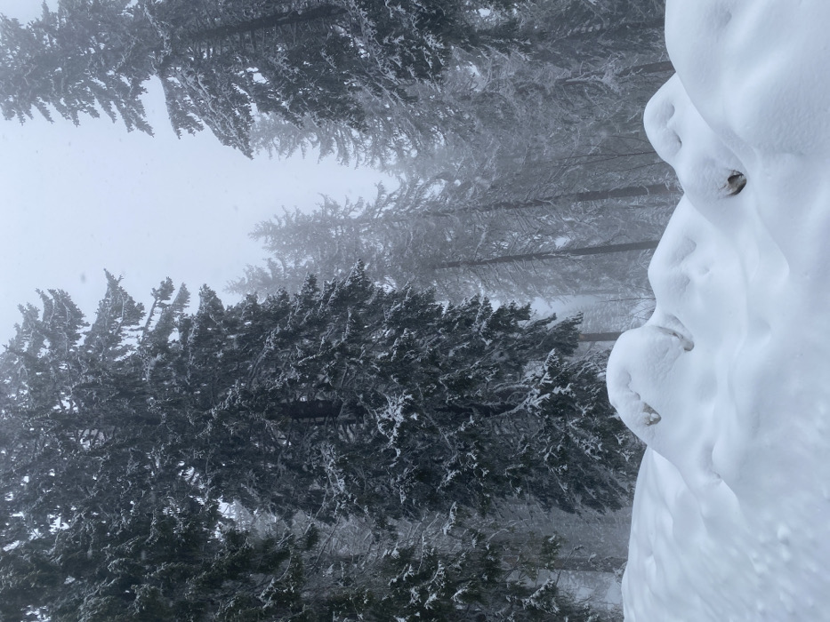 The image displays a dense evergreen forest experiencing heavy snowfall, located in the vicinity of the city of Smolyan, Bulgaria. In the immediate foreground, a substantial accumulation of fresh, white snow forms irregular, undulating mounds. The snow appears undisturbed, indicative of recent or ongoing precipitation. Extending from the midground into the background are numerous tall coniferous trees, primarily spruces or firs, heavily laden with snow on their branches and needles. The trees' dark green and grey foliage contrasts with the white snow covering. Fine, individual snowflakes are visible descending against the backdrop of an overcast, diffused light-grey sky, which is partially obscured by atmospheric haze and the ongoing snowfall. Visibility diminishes progressively towards the background due to the combined effects of snow and mist. No individuals, man-made structures, or animals are present in the scene. The overall environment is a winter landscape characterized by deep snow and active precipitation.