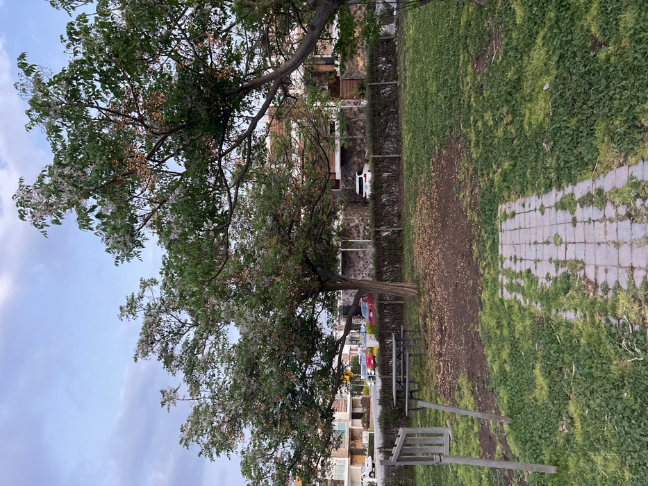 The image depicts an outdoor scene in Arroyo Hondo, Mexico, featuring a green space bordering a residential street under an overcast sky