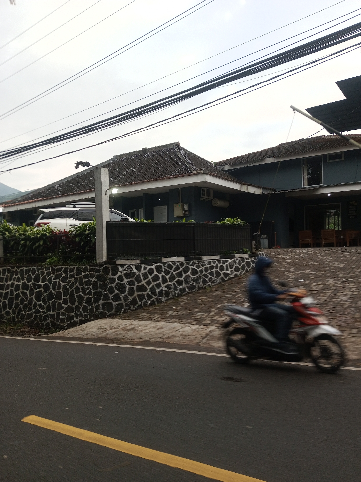 A photograph captures a blurred motorcyclist on a road in front of a building. The building, a muted blue with a brown tiled roof, is partially obscured by a black stone wall with vegetation along the top. A white vehicle is parked in front of the building. Above, several power lines stretch across the gray sky. The road has a yellow line marking the edge. The location is indicated to be Taunggyi, Myanmar.