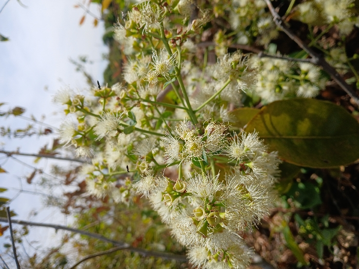 This image depicts a close-up of a flowering plant in Unguwar Saya, Nigeria, under natural daylight conditions. The primary subject is a dense cluster of small, white, fluffy flowers with numerous fine stamens, giving them a delicate, feathery appearance. Each flower exhibits a light green base and central structure. Dark green, ovate leaves are interspersed among the flower clusters, with one prominent leaf visible in the lower central portion of the frame. Two small, dark-bodied insects, possibly flies, are visible resting on separate flowers within the upper half of the main cluster. The background is out of focus, revealing blurred brown and green foliage, sparse tree branches, and a bright, light blue sky above. The scene appears to be an outdoor natural environment.