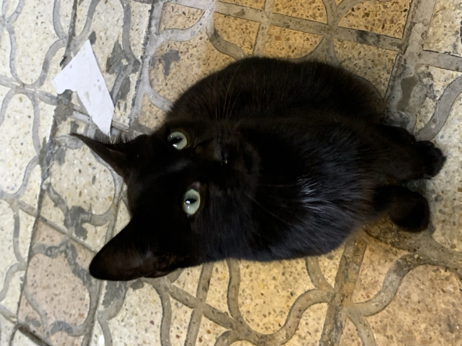 - "A black cat lies on patterned tiles, its body curled in a relaxed position" by FM-Gn7EC2, licensed under CC BY 4.0