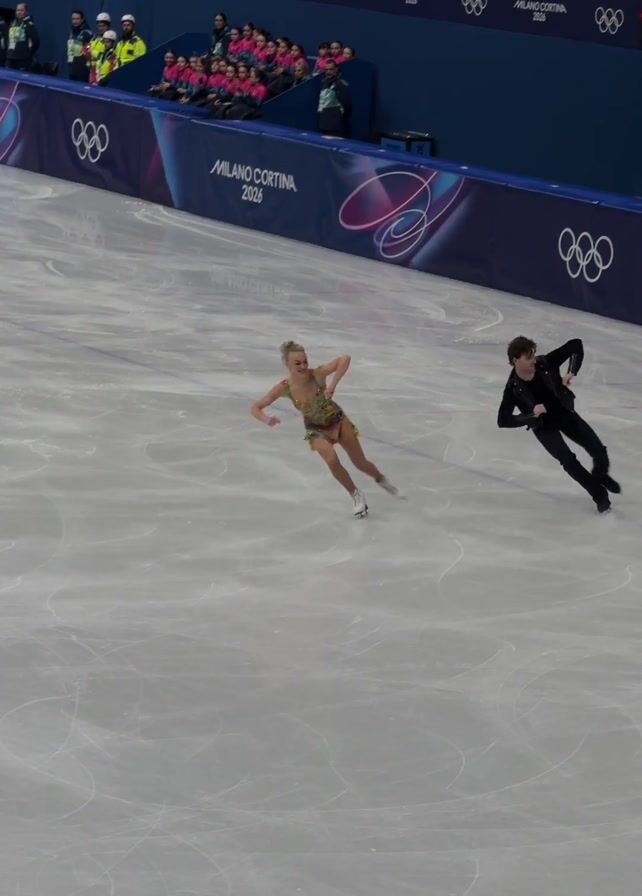 A figure skating pair performs on an ice rink. The female skater wears a colorful dress, while the male skater is dressed in black. They move in tandem, their arms extended for balance. The arena is packed with spectators. Banners with the words "MILANO CORTINA 2026" and the Olympic rings adorn the background. The ice surface is marked with skate traces.