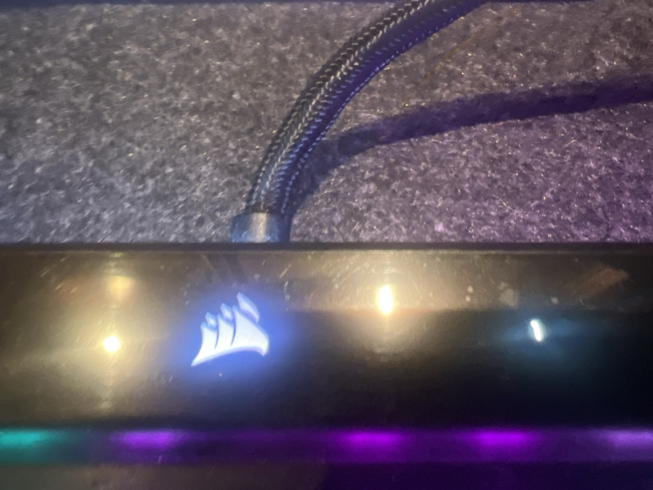 A close-up shows a Corsair computer component. The Corsair logo is illuminated in blue. Above, a braided cable runs across a textured, possibly carpeted, surface. Light reflections are visible on the component’s surface. A faint purple and teal glow emanates from below the component. The image appears to be taken in low light conditions.