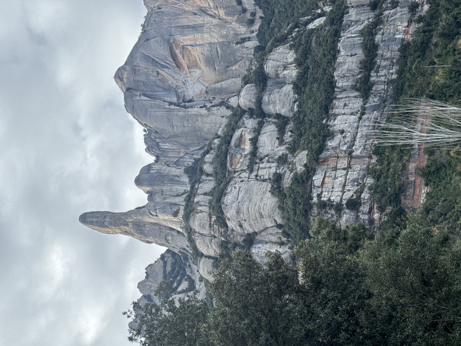 This image depicts a mountainous landscape in Monistrol de Montserrat, Spain, under an overcast sky