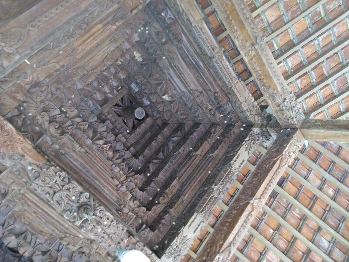 An upward-angled view captures a richly carved, dark-stained wooden ceiling within a structure in Dulce Nombre de Jesús, Costa Rica
